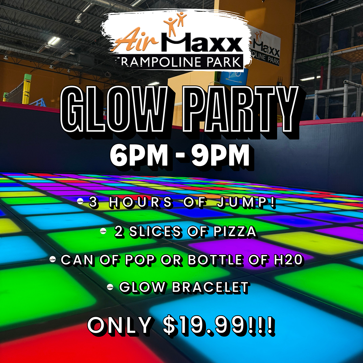 UPGRADE GLOW PARTY!!! 3, 2, 1, Blast off with AirMaxx's new & upgraded Glow Party!! 3 Hours of FUN, 2 slices of pizza and 1 Refreshment gives families the Most FUN for the money. If parents want to sneak in a date night, responsible Kids 12 and older are welcome to enjoy the Glow Party without parents being present.